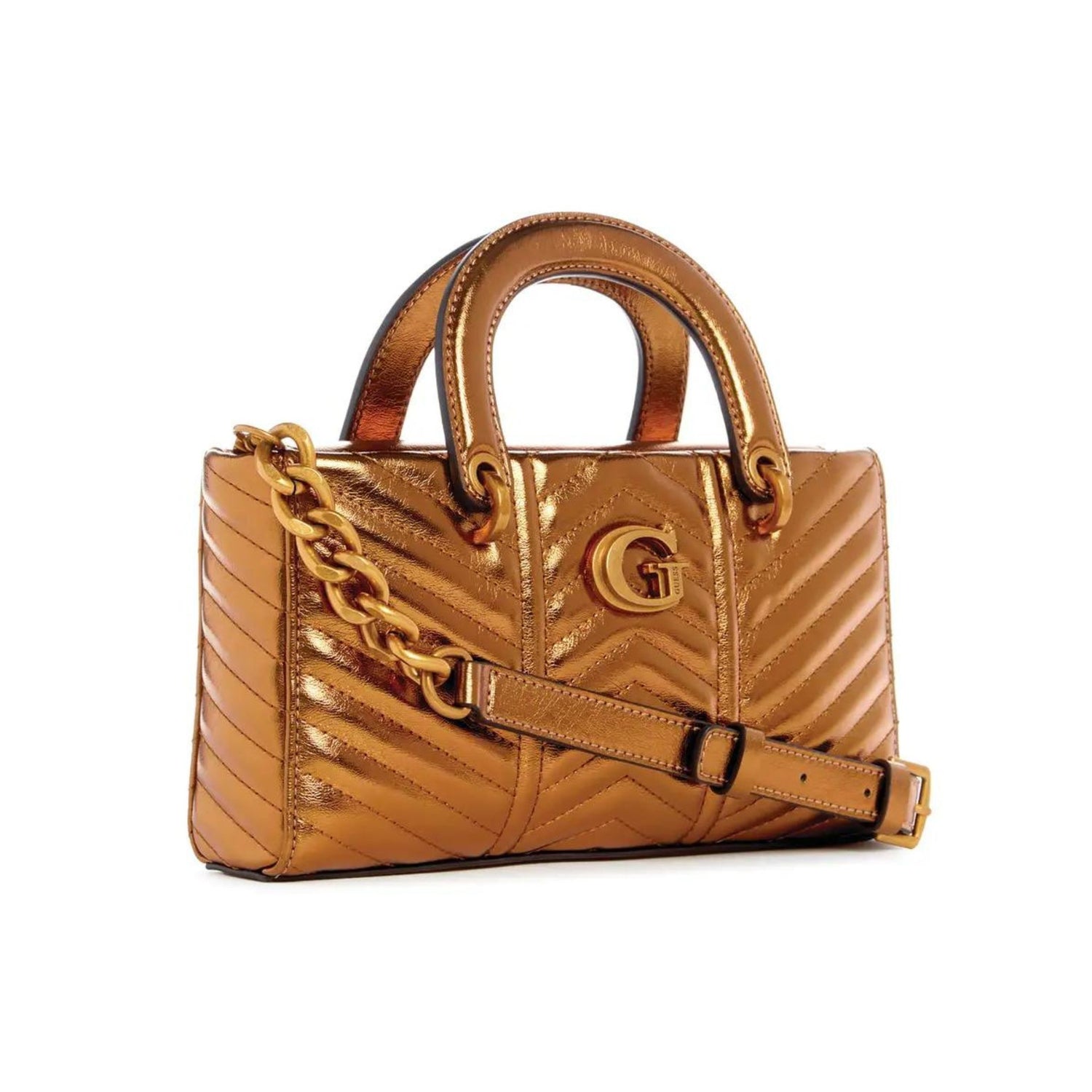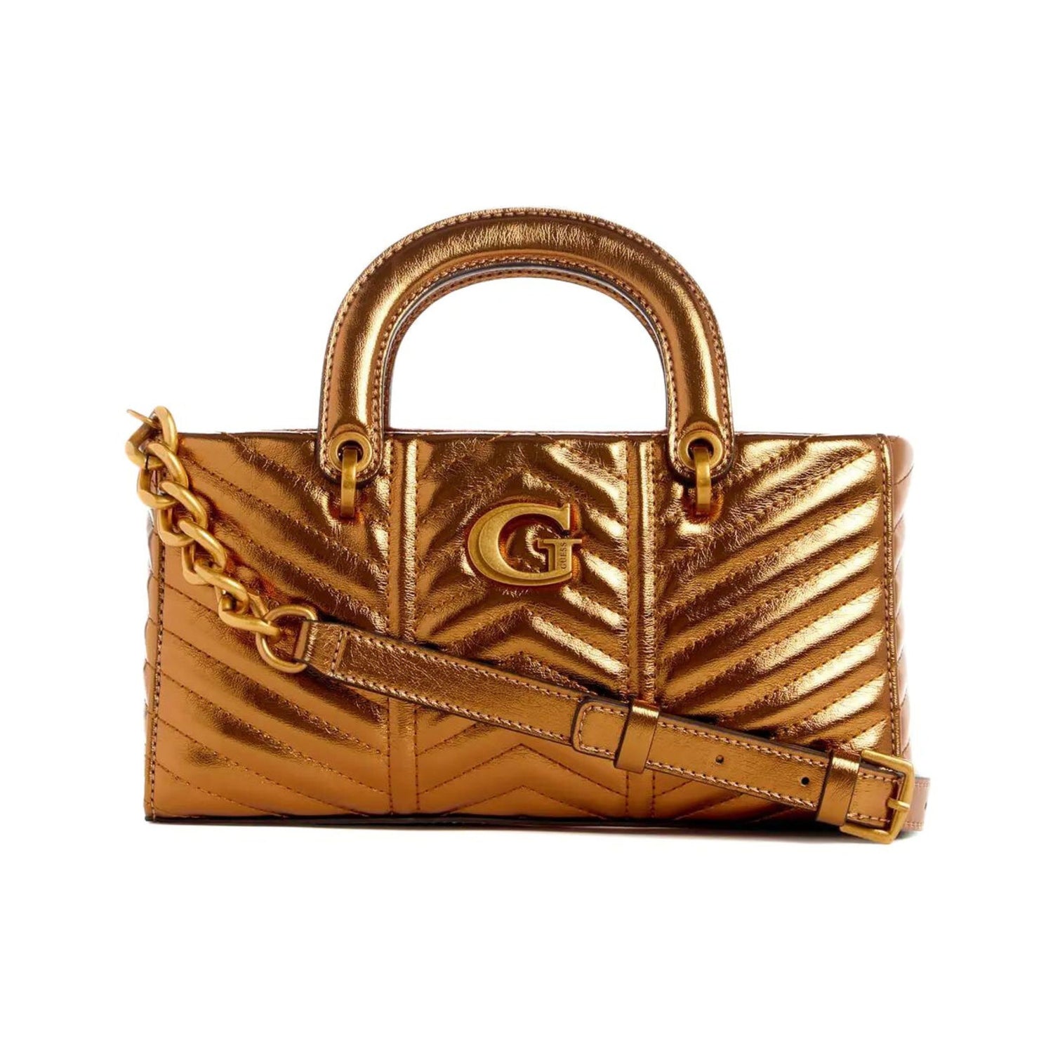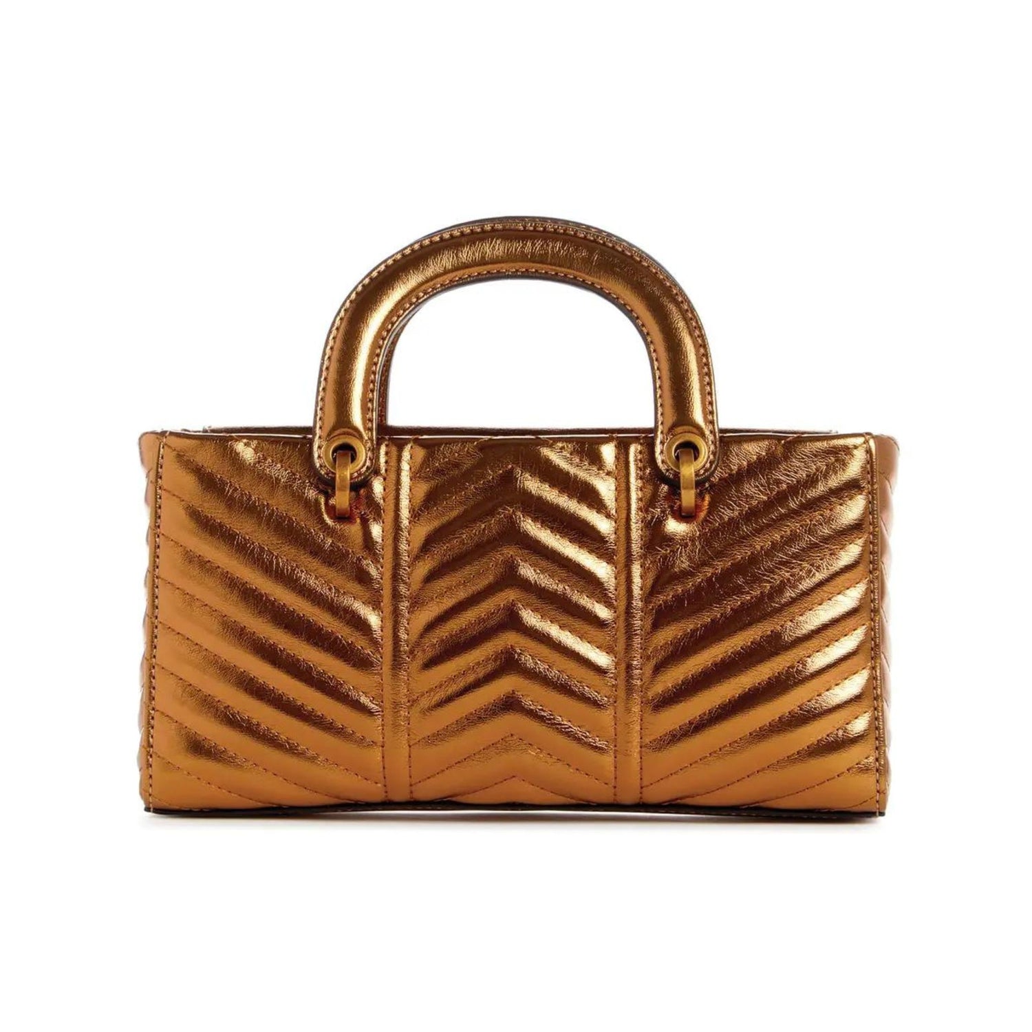 - Metallic faux-leather mini satchel with a quilted design and antique bronze-tone hardware.